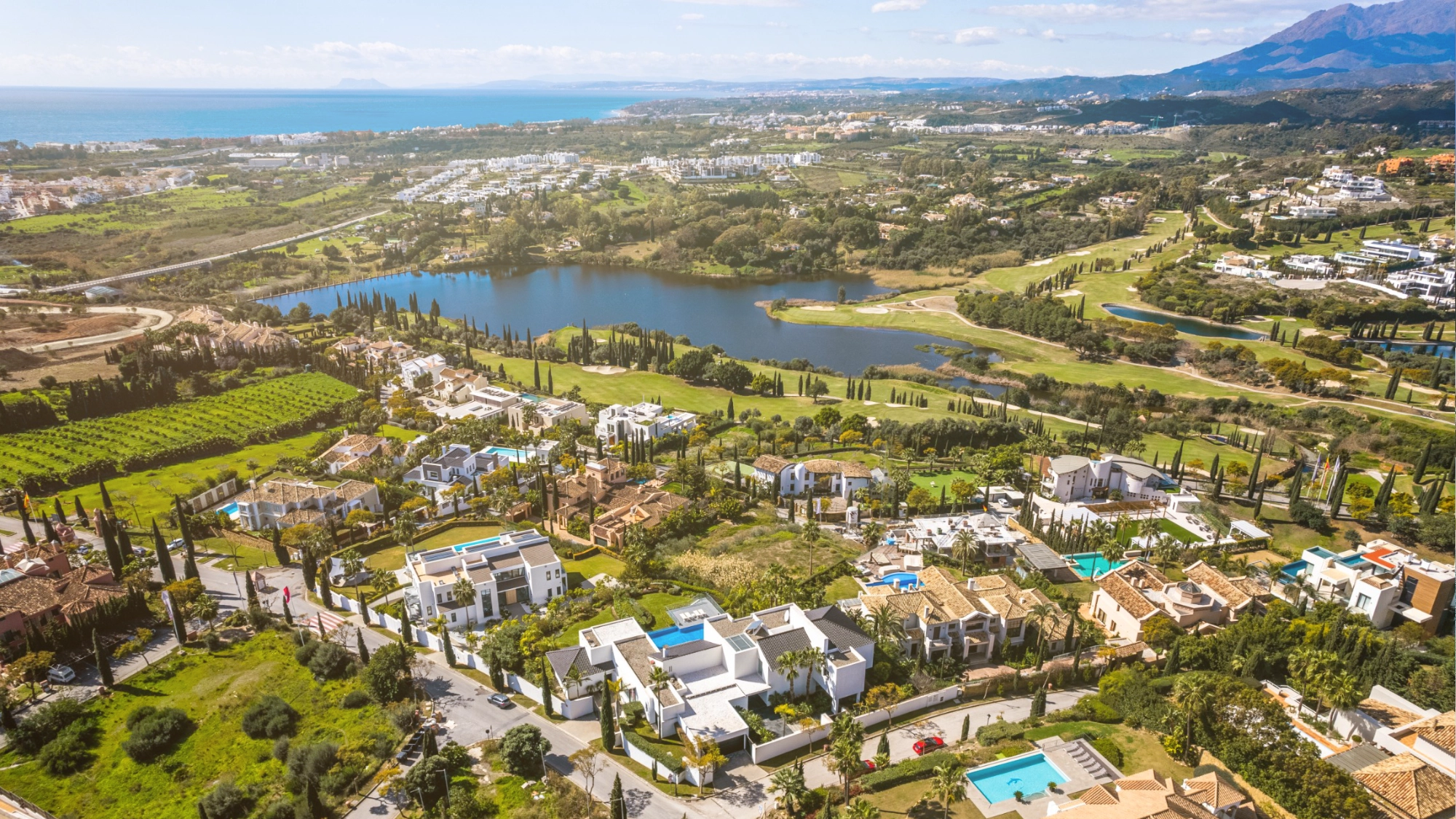 The New Golden Mile stretches west from Marbella to Estepona, featuring new luxury developments, golf courses, and beachfront properties.