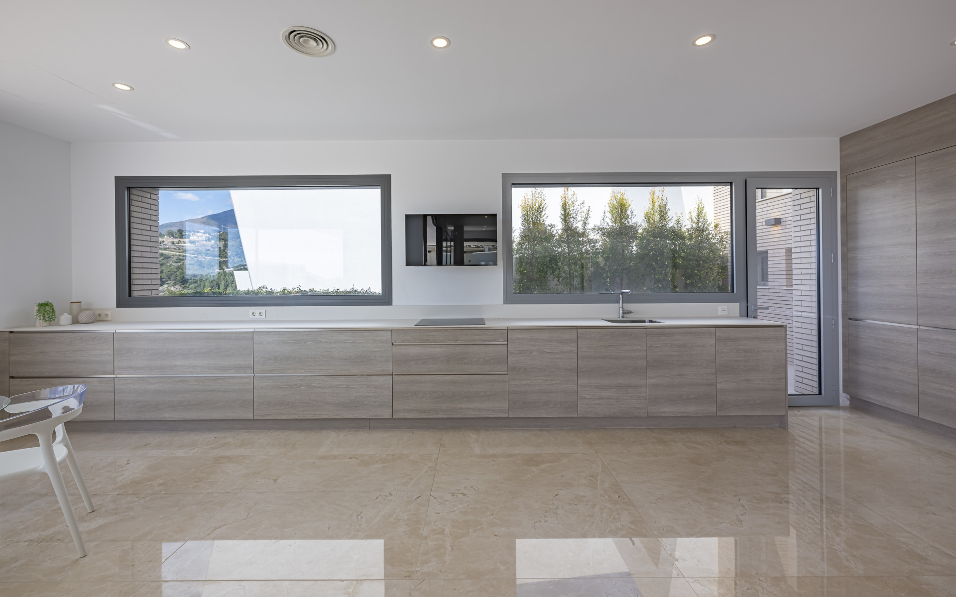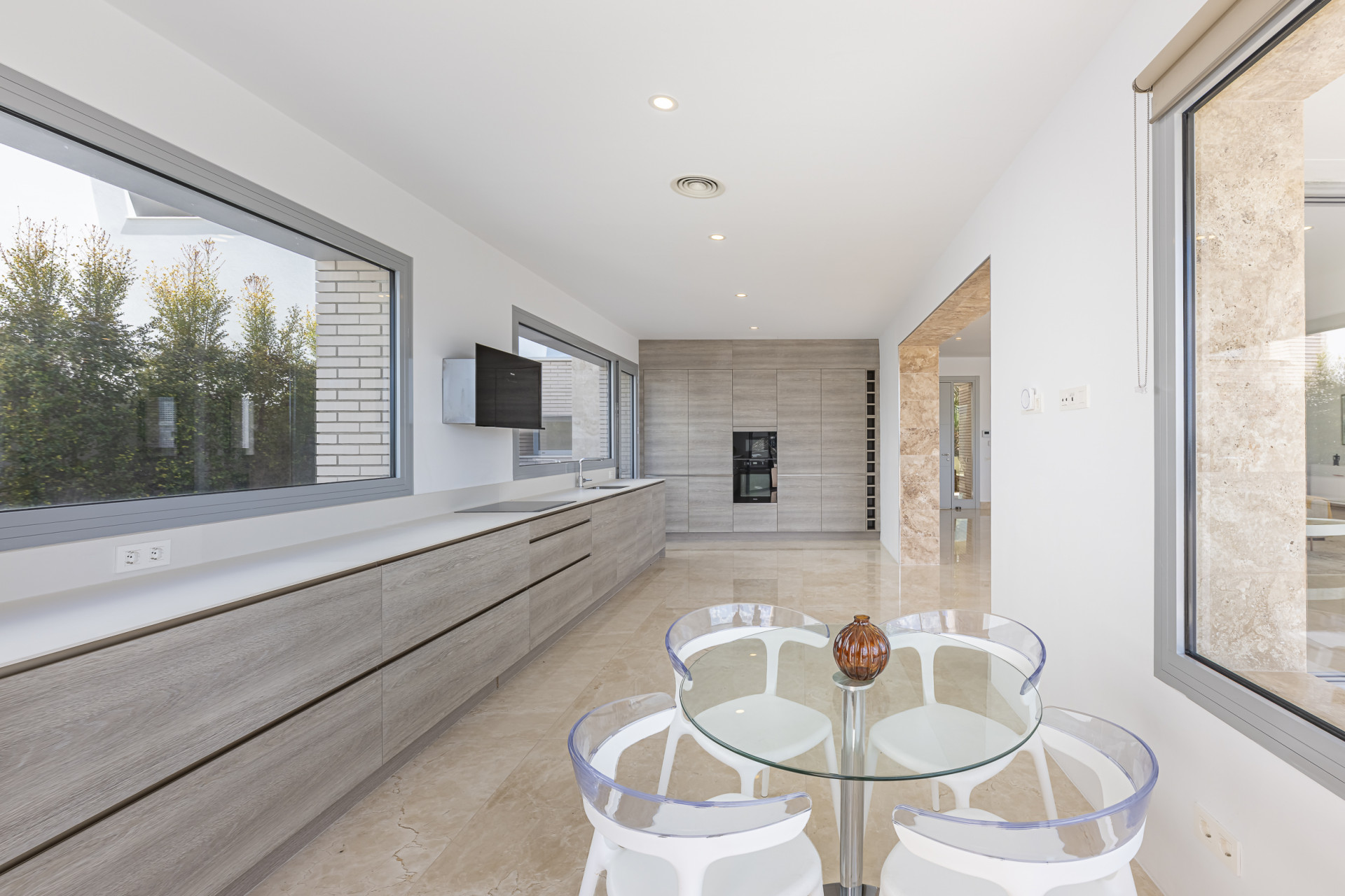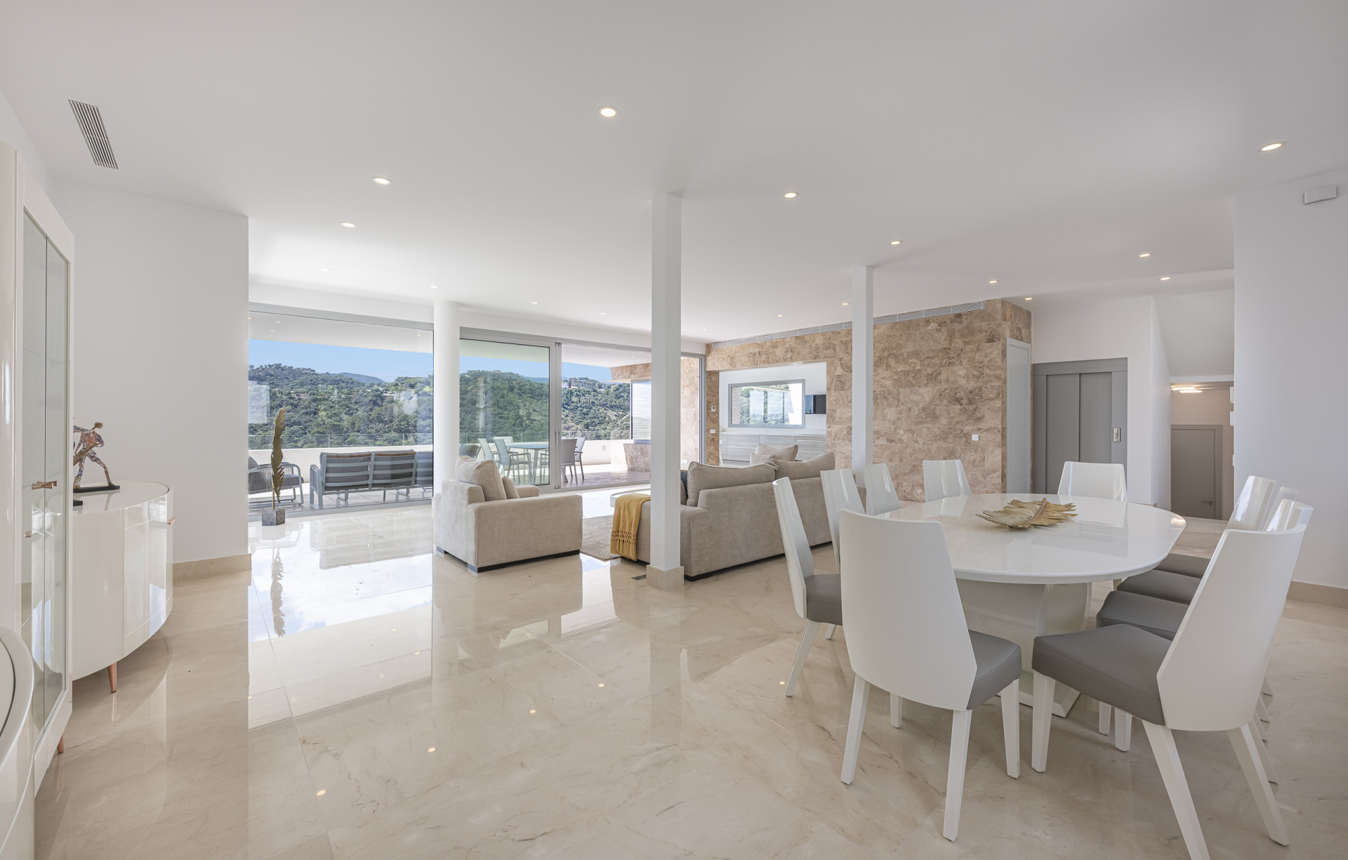 Built over multiple levels, the villa is modern and well-designed, with a lift that connects all floors, including a spectacular rooftop terrace with scenic sea and golf views. The open-plan layout combines a large living and dining area with a fully fitted kitchen that opens directly onto the terrace—ideal for outdoor dining or relaxing in the sun. On the main floor, four en-suite bedrooms offer privacy and comfort. Two more bedrooms are located on the lower level, alongside staff quarters. A spacious basement and an additional 120 m² unfinished space below could be transformed into a home cinema, private gym, or spa. Quality finishes such as natural stone and Travertine marble flooring can be found throughout the home.