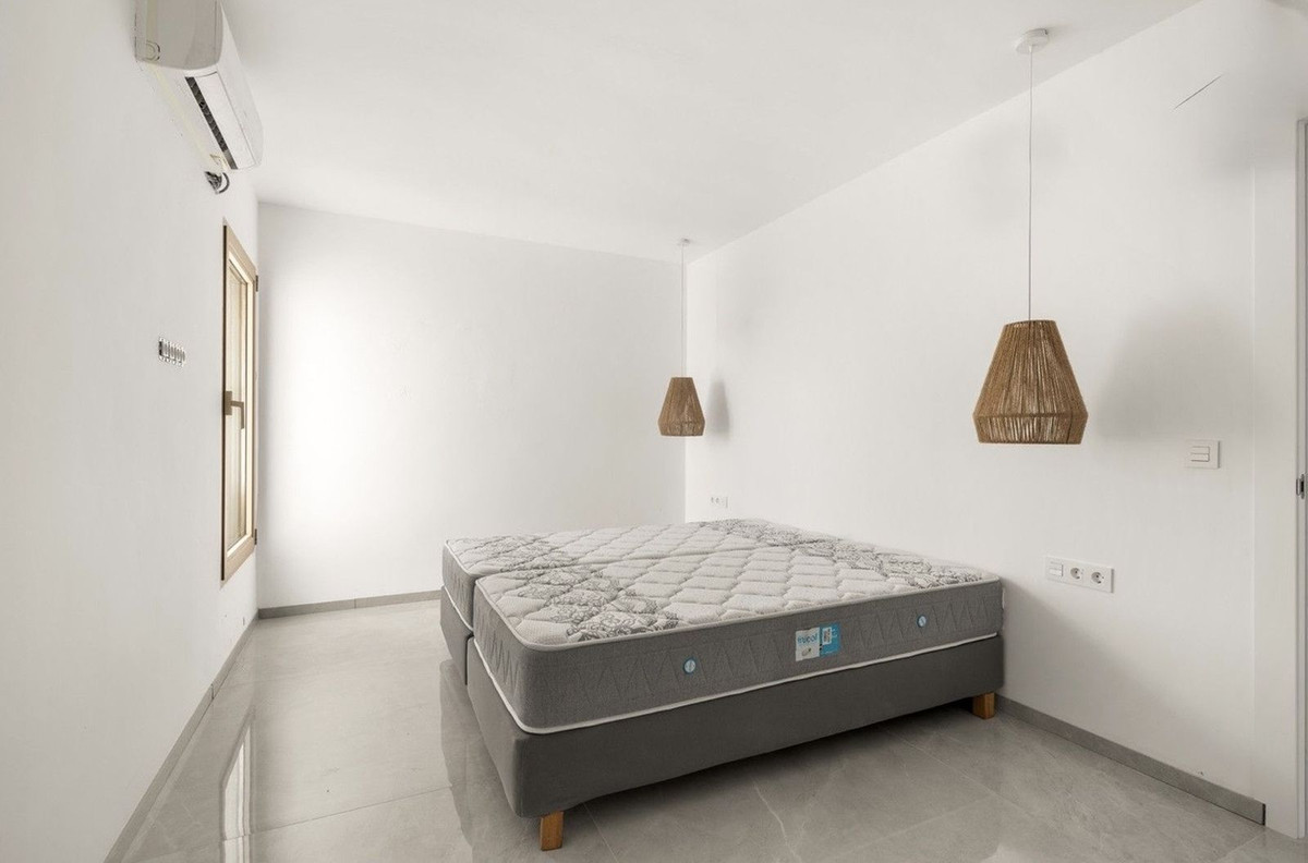 Also located on this level is a spacious bedroom with an ensuite bathroom, ideal for guests or ground-floor living. A striking spiral staircase leads to the upper floor where a second bedroom enjoys stunning views across the Mediterranean. This level also offers the possibility to create a luxurious master suite with walk-in wardrobe and a large bathroom with both bathtub and walk-in shower, while additional space on the main level allows for the potential creation of a further bedroom if desired.