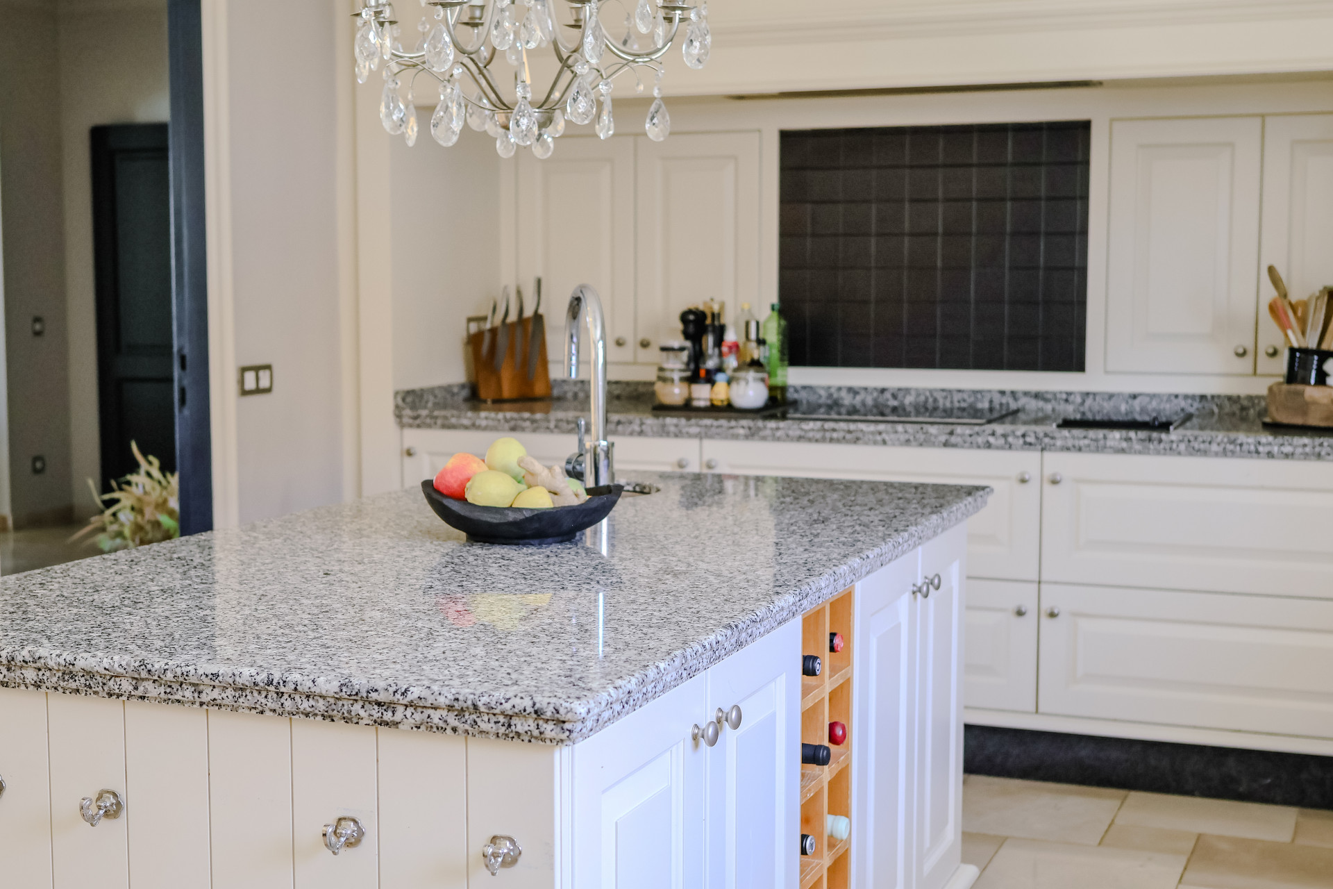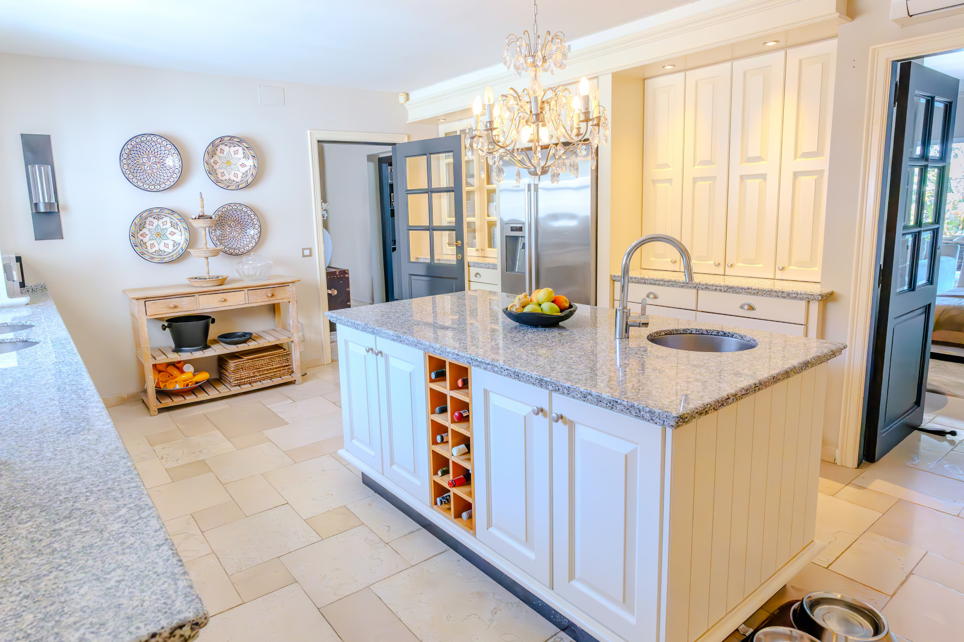 The villa’s heart is its stunning open kitchen and dining area. Designed for both everyday comfort and entertaining, it features elegant stone countertops, a spacious central island, and seamless flow to the outdoor terraces. It’s easy to imagine slow mornings with coffee in the sun or long evenings with friends as the Mediterranean breeze drifts through the open doors.