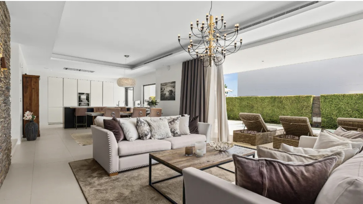 Designed in a refined contemporary architectural style, the villa welcomes you with a bright and spacious entrance that leads seamlessly into the main living area. Large windows allow natural light to flood the interiors, creating an atmosphere that is both warm and sophisticated. The living room flows effortlessly into the dining area, forming an open and inviting space ideal for both everyday living and entertaining guests. From here, expansive terraces extend outward, offering covered lounge areas and a pergola dining space that overlooks the landscaped garden and heated swimming pool, creating the perfect setting for outdoor gatherings or peaceful relaxation.