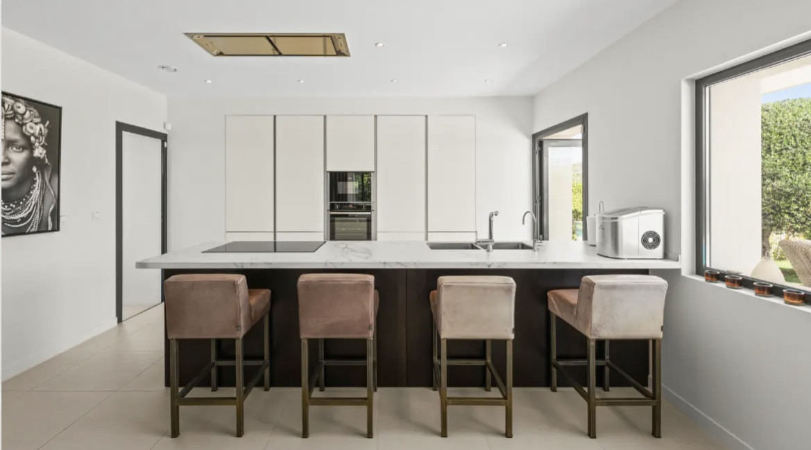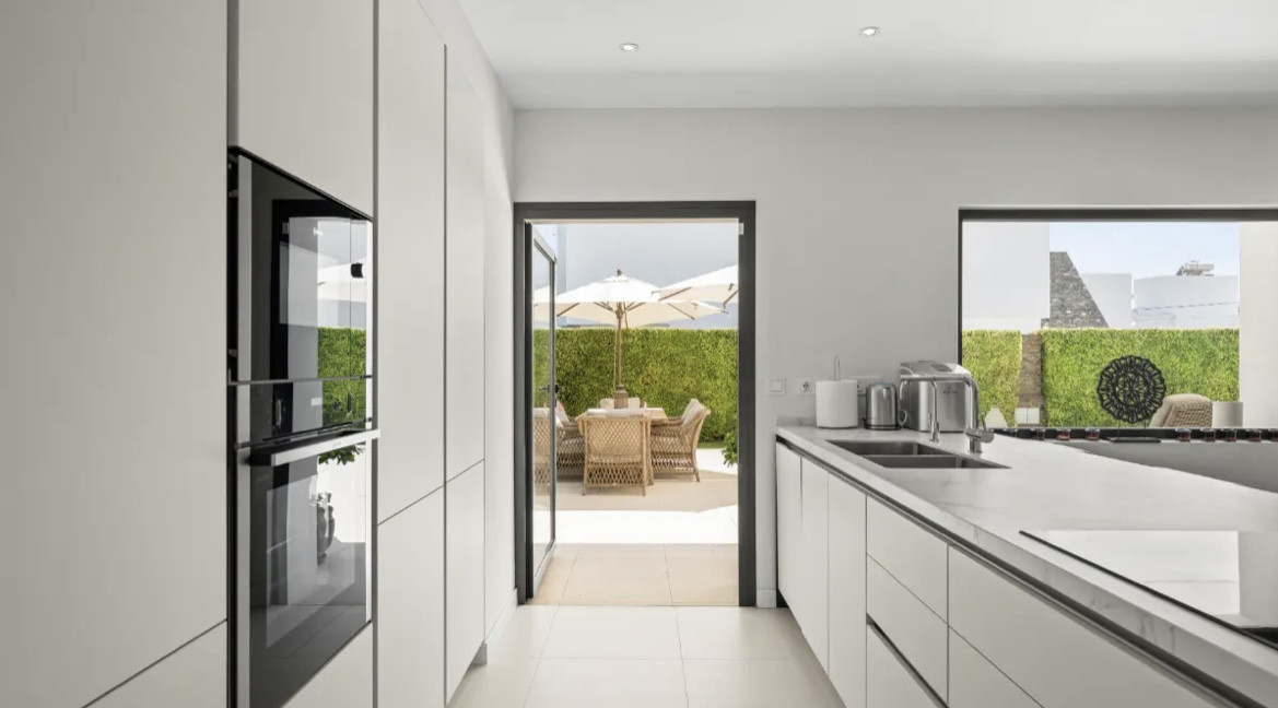 The modern open-plan kitchen connects naturally with both the dining area and outdoor terraces, creating a practical yet stylish heart of the home. Designed with both functionality and aesthetics in mind, it features a central island, integrated appliances, and a charming breakfast terrace where mornings can begin with views of the garden.